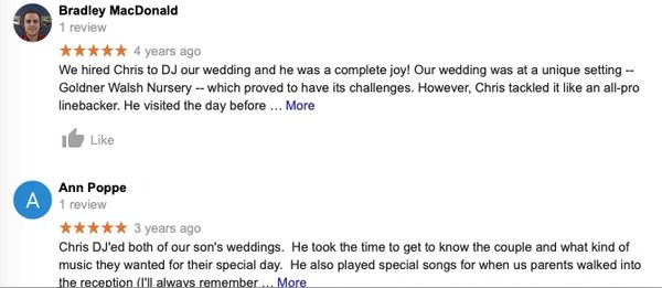 We play your song list and requests. You tell us what styles of music you like and your guests like. We have access to 25 million songs plus a internet connection at the wedding reception. Our goal is to make it fun for you and your guests so if you like a line dance like Cha Cha Slide or the Wobble we will play it. We play a variety of songs that will get people on the dance floor. Fast songs and slow dances too. We discuss your music with you to give us the best success. Important dances: First Dance , Daddy Daughter , Mother Son , Bridal Party , Couples dances , Bouquet toss , Garter , Dollar Dance , Anniversary Dance. You can pick and choose whatever you want at your wedding.